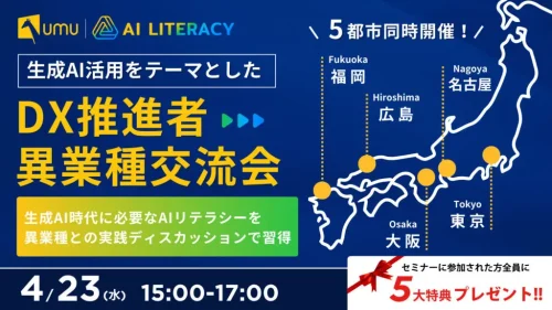 ユームテクノロジージャパンは、異業種の参加者同士が企業内の生成AI活用における課題・悩み・アイデアを共有し、新たなインサイトを得る場「DX推進者 異業種交流会」を東京・大阪・名古屋・広島・福岡の5都市同時で4月23日から開催する。