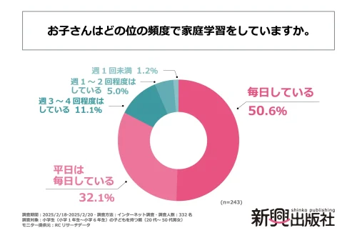 調査は、小学1年生~6年生の子どもを持つ親を対象に2月18日~20日に行われ、332名から回答を得た。それによると、小学生の7割以上は家庭学習の習慣のあることが分かった。家庭学習の習慣のある小学生を持つ親の約50%は「毎日家庭学習をしている」と回答した。