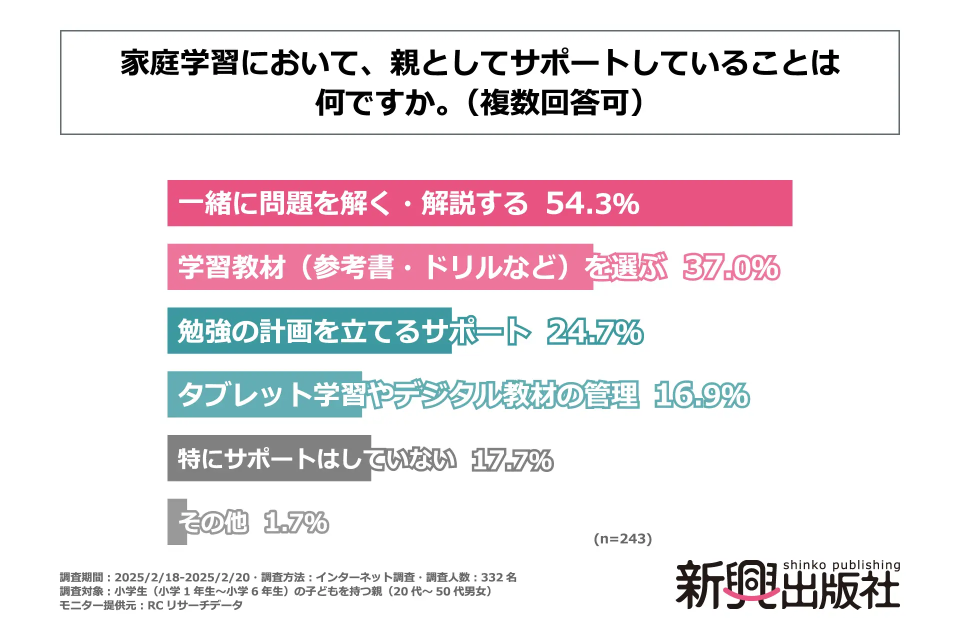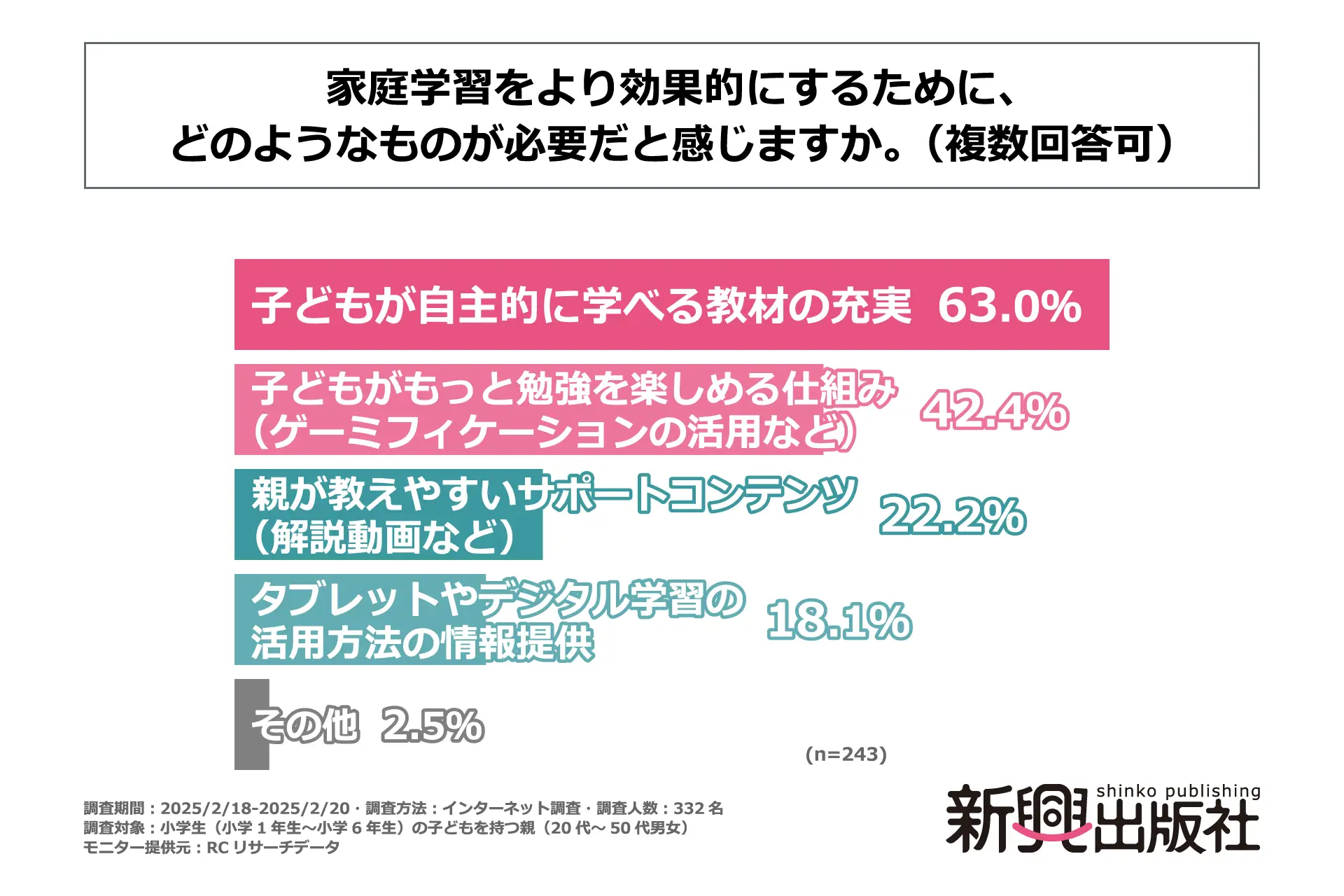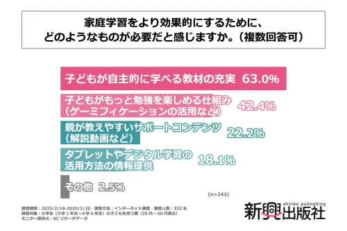 家庭学習で親としてサポートしていることを訊ねたところ、「一緒に問題を解く、問題の解説をする」が最も多く、次いで「学習教材を選ぶ」「勉強の計画を立てるサポート」と続いた。また、家庭学習をより効果的にするために「子どもが自主的に学べる教材の充実」が必要だと考えている親が多いことも分かった。