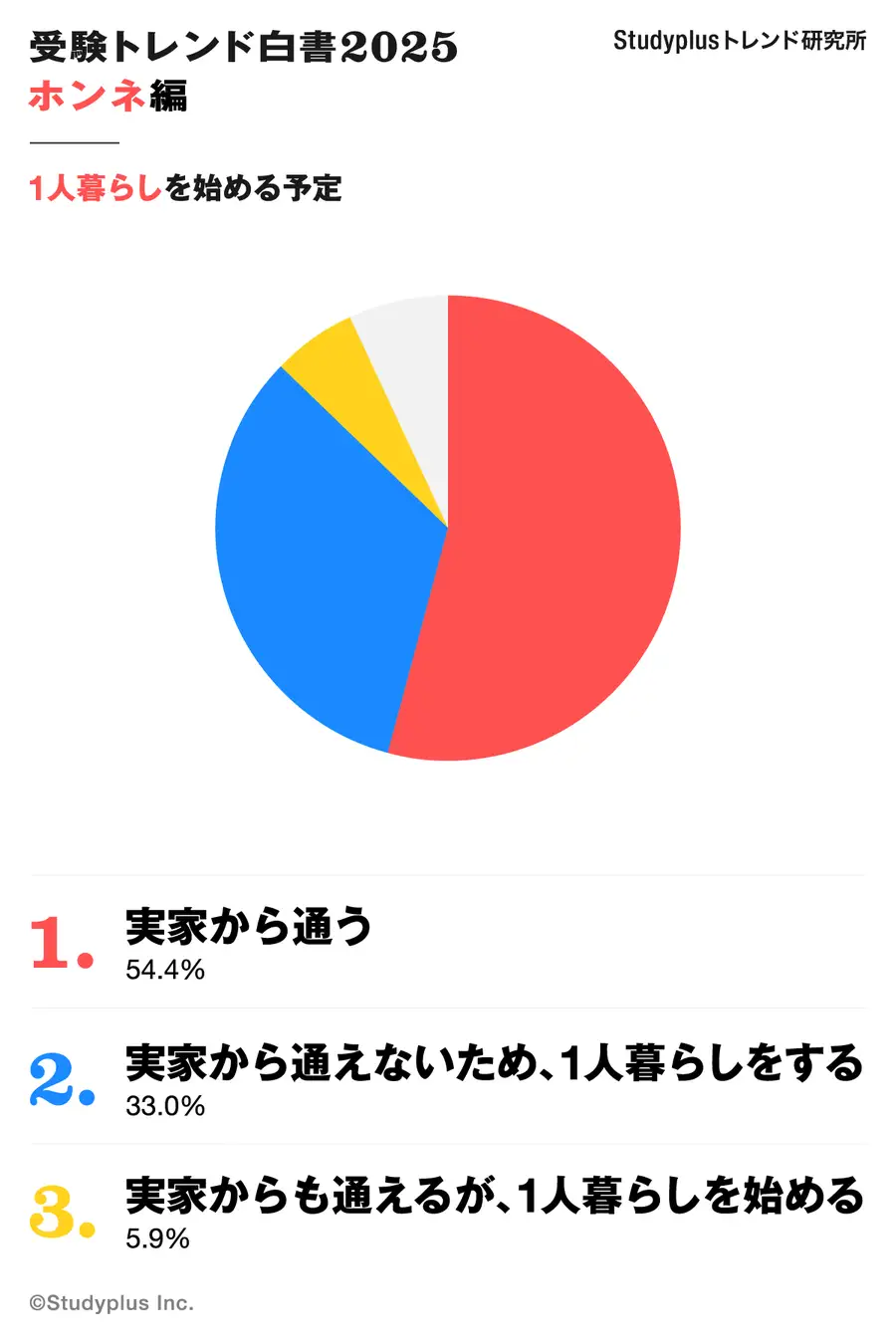 調査は12月14日~2月18日に学習管理アプリ「Studyplus」上で、2024年度に大学受験をしたユーザー1363名を対象に行われた。それによると、大学生になったら実家から通う人が半数以上を占めた。
