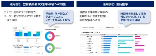 また、持ち帰り学習において学校別で利用率が高い学習関連サイトを確認したり、時間帯別の利用状況を可視化したりすることで、例えば、深夜帯に端末を使っている児童生徒への指導に活かすことができる。