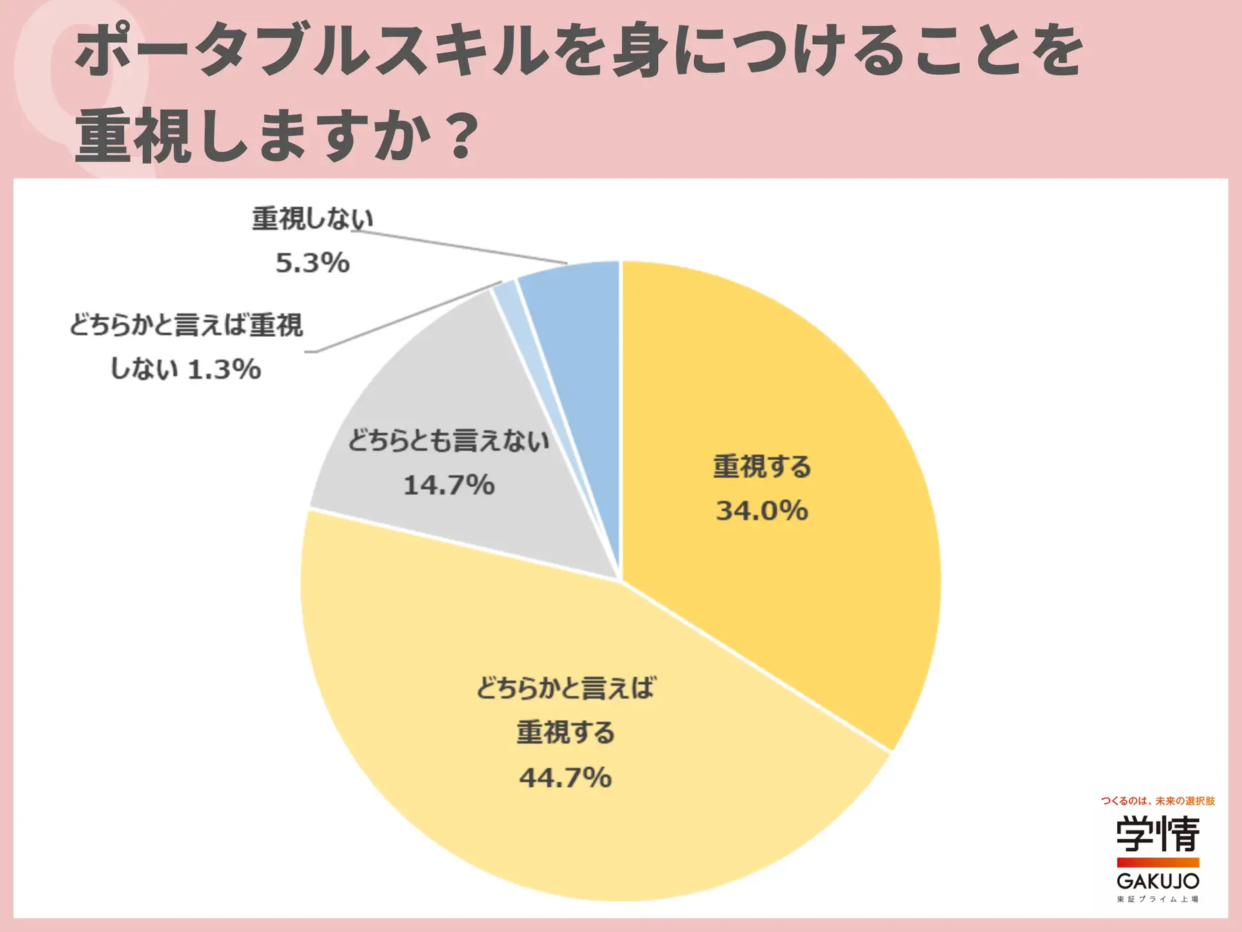 そこで、「ポータブルスキルとは、仕事が変わっても持ち運びできるスキルのことです」と伝えたうえで、身に付けることを重視するかを尋ねたところ、「重視する」と回答した学生が34.0%。「どちらかと言えば重視する」44.7%を合わせると、78.7%に上り、約8割の学生がポータブルスキルの習得を重視していることがわかった。