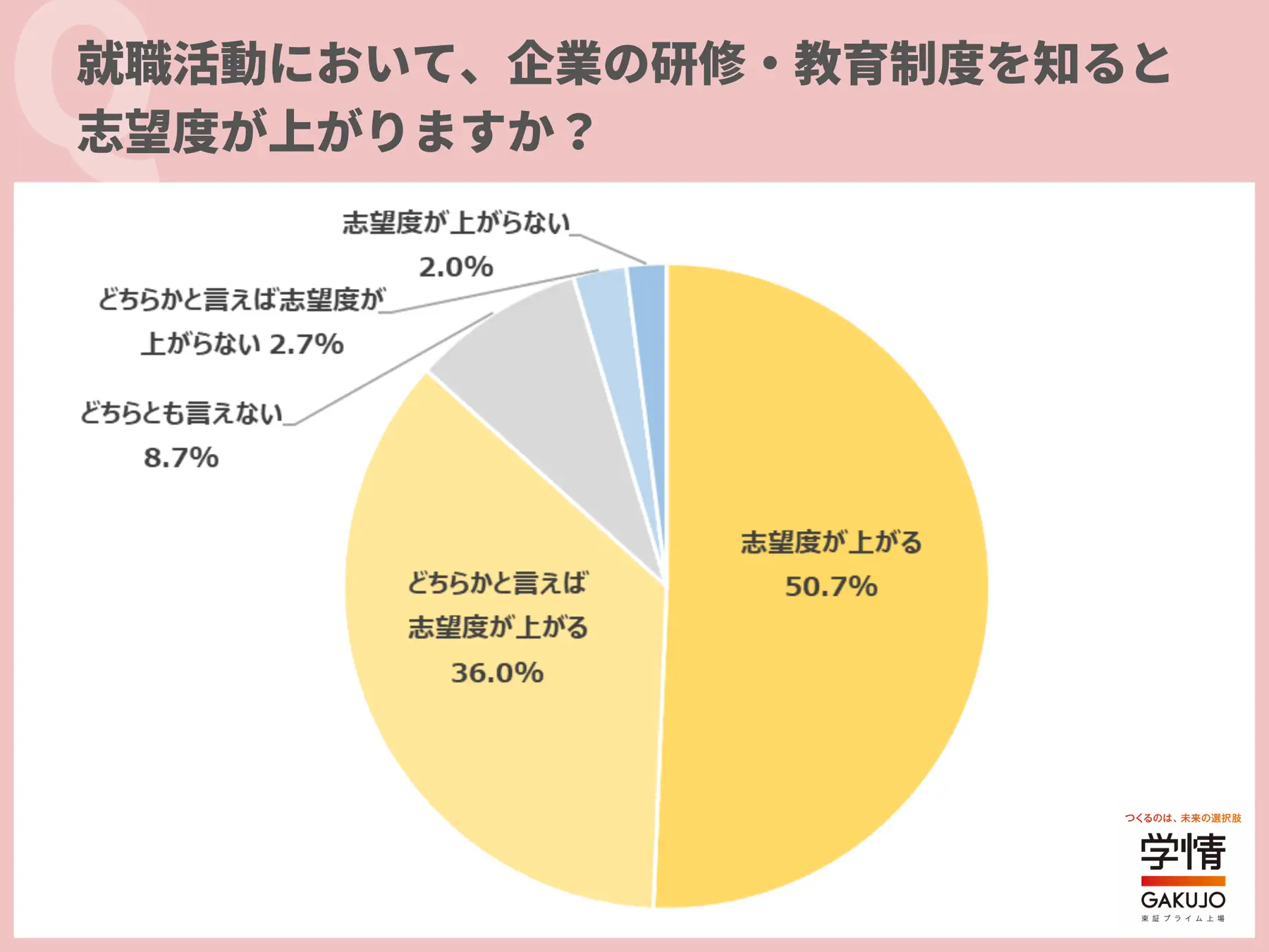 就職活動において、企業の研修・教育制度を知ると「志望度が上がる」と回答した学生は50.7%。「どちらかと言えば志望度が上がる」36.0%を合わせると、86.7%を占め、9割近い学生が研修・教育制度を知ると志望度が上がるとしている。