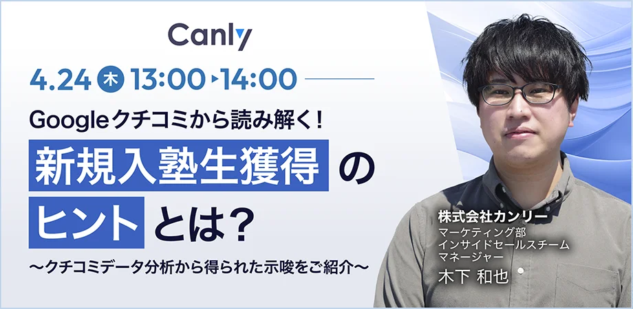 カンリーは、無料オンラインセミナー「Googleクチコミから読み解く!新規入塾生獲得のヒントとは?〜クチコミデータ分析から得られた示唆をご紹介〜」を、4月24日に開催する。