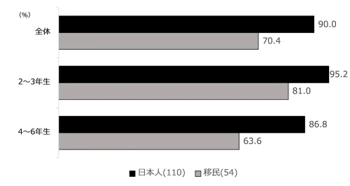 体育の単元では水泳(水遊び・水泳運動)を好む移民の児童が特に多かった。マット運動や鉄棒、跳び箱といった器械運動の単元は日本人より「好き」の割合が低かった。校内でスポーツや運動遊びをしている児童は日本人90.0%、移民70.4%で、高学年で差が顕著となっている。また、ドッジボールは日本人男子、おにごっこは日本人女子で特に実施率が高かった。
