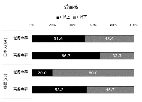 運動有能感を訊ねた項目のうち、受容感(「先生が励ましてくれる」「友だちが励ましてくれる」)の得点群別(低得点群と高得点群)に体力テストの総合得点が「C以上」であった割合を比較すると、移民は日本人より低得点群と高得点群の差が大きい傾向が見られた。