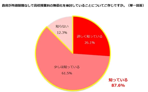 それによると、所得制限なしでの高校授業料無償化の検討について「知っている」と回答したのは87.6%。所得制限なしでの高校授業料無償化について「賛成」と答えたのは76.1%、「公立も私立も反対」と答えたのは13.7%だった。