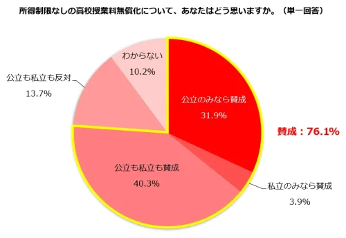 高校授業料無償化「所得制限なし」を主婦層は「賛成」76.1%「公立も私立も反対」13.7%=しゅふJOB総研調べ=