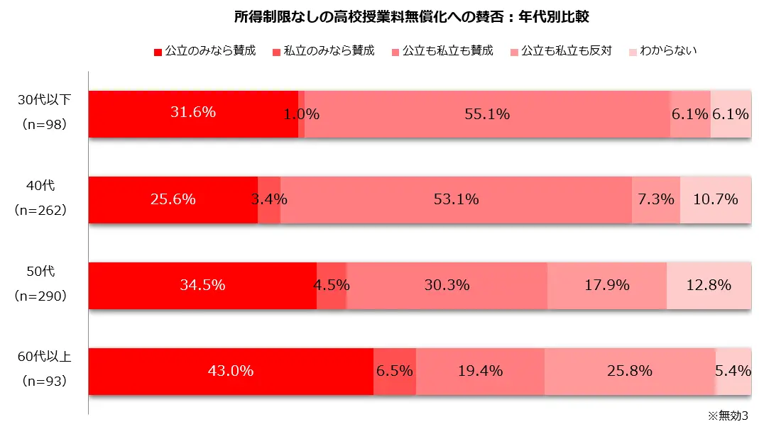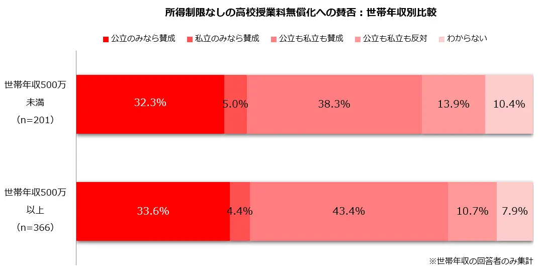 調査では、所得制限なしでの高校授業料無償化への賛否について、子どもの有無別、年代別、世帯年収別の比較とともに、寄せられたフリーコメントを掲載している。
