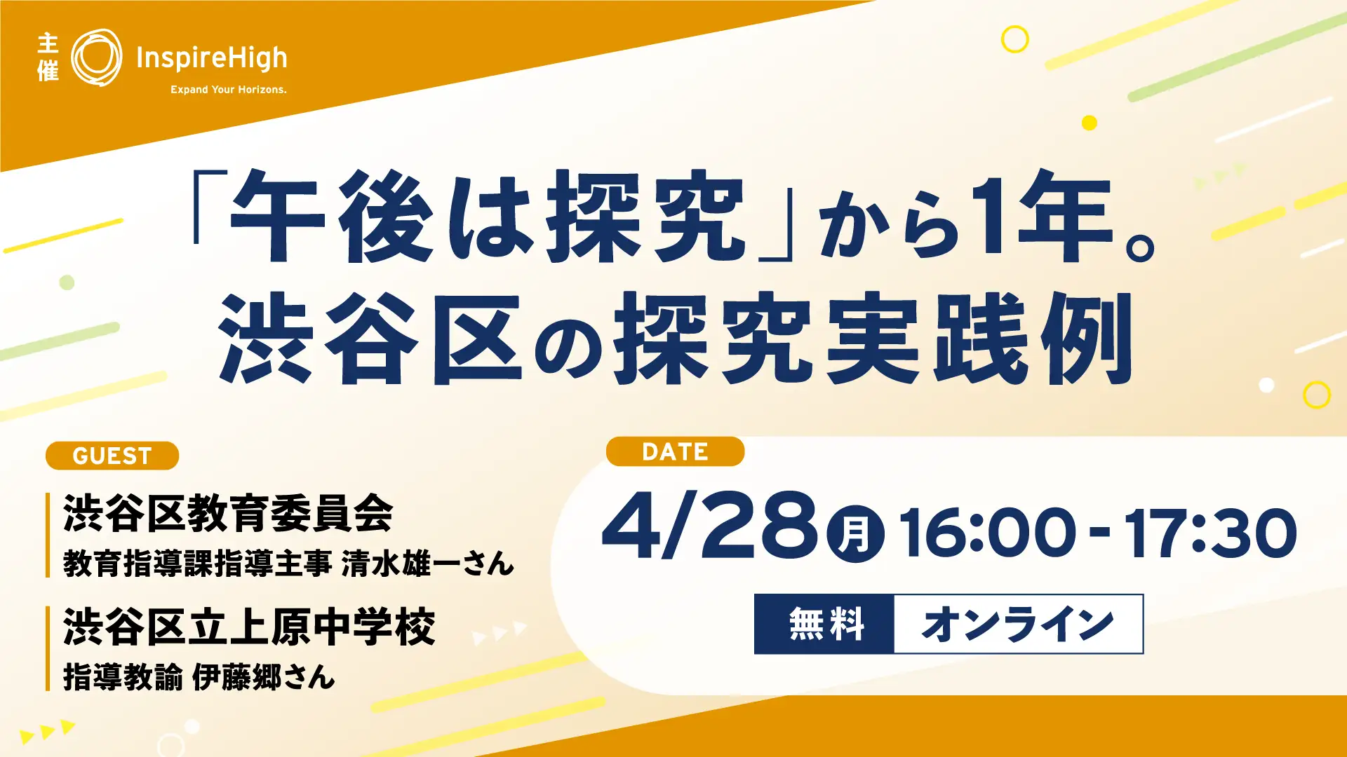 Inspire Highは、東京・渋谷区の探究事例を紹介する中高教員向けのオンラインセミナーを4月28日に開催する。