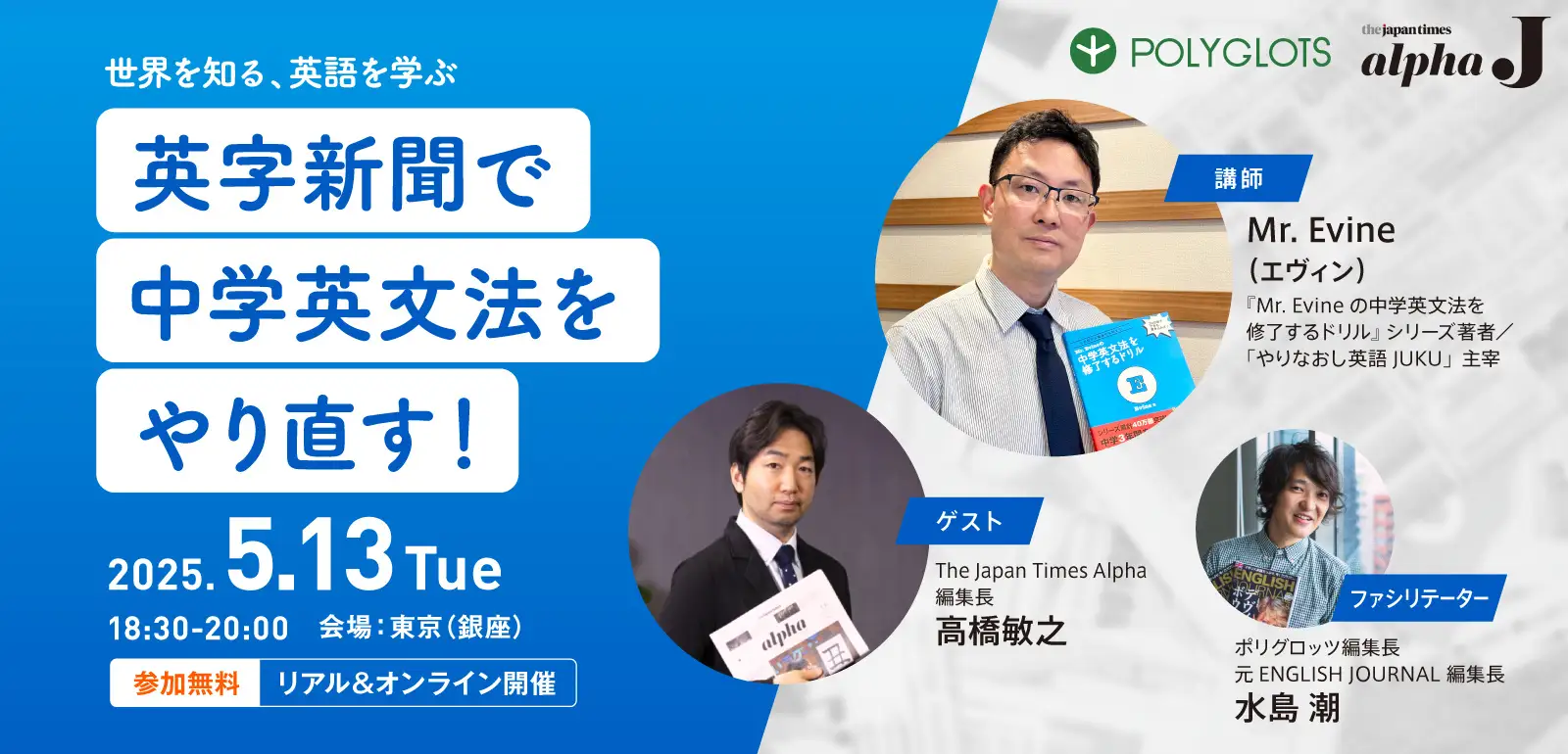 ポリグロッツは、英語学習者のための無料セミナー「英字新聞で中学英文法をやり直す!」を5月13日に開催する。