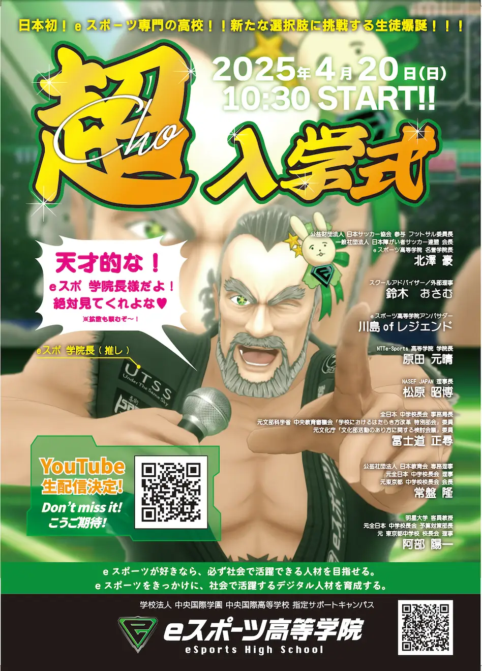 4月20日にシブヤeスタジアムを会場に、全国7拠点とオンライン生をつないで行われる超入学式には、新たにスクールアドバイザー/外部理事に就任した鈴木おさむ氏をはじめ、名誉学院長の北澤豪氏、アンバサダーの川島ofレジェンド氏、お笑いコンビのガリットチューも駆けつける。当日のYouTube生配信も決定した。