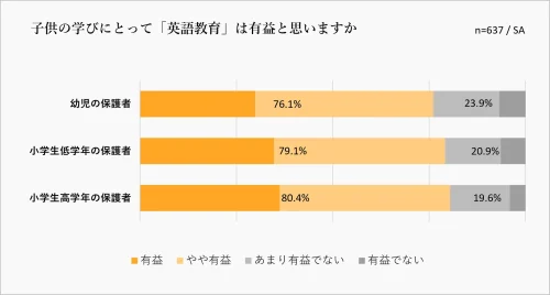 子どもの成長につれて受験に肯定的となる傾向が見られ、世代を経るごとに受験を有益と考える傾向があり、小学校受験には49.8%、大学受験には75.8%、就活には85.0%が肯定的だった。また、国際感覚の育成には消極的だが、英語教育には熱心で、幼児・小学生への「英語教育」が有益と考える人が約8割を占めた。AIの利用に関しては、小中高の各世代で保護者の意見が真っ二つに分かれた。