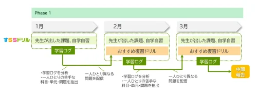 第1フェーズでは、1月の課題提出や自学自習の学習ログを同社が分析し、児童個人のドリル正答率が低い順に5つのユニットを「おすすめ復習ドリル」として2月上旬に配信したほか、2月の学習ログも同様に分析し、3月上旬に「おすすめ復習ドリル」を個別に配信。取り組みはすべて児童の任意としながら、継続的な学習促進を図った。