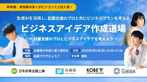 中高生向けアントレプレナーシップ教育プログラム「起業ゼミ」を運営するガイアックスは、日本政策金融公庫・兵庫県・神戸市と連携して、1day起業アイデア考案プログラム「ビジネスアイデア作成道場~起業支援のプロとビジネスアイデアを考えよう~」を6月1日に実施する。