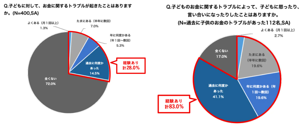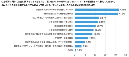 小中学生の子どもを持つ母親に、子どもに対して、お金に関するトラブルが起きたことがあるか聞いたところ、4人に1人以上(28.0%)の親があると回答。さらに、お金トラブルによって子どもに怒ったり言い合いになったりしたことがあるのは8割以上(83.0%)で、その原因は、「お金や買ったものの大切さを理解していない」(43.0%)が最多だった。