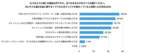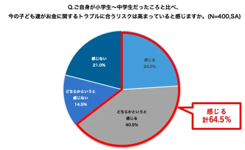 「自身が小学生~中学生だった頃と比べ、今の子ども達がお金に関するトラブルに合うリスクは高まっていると感じているか」と聞いたところ、6割以上(64.5%)が「(高まっていると)感じる」と回答。理由は「子どもへのデジタルデバイス(スマホ・ゲーム機)の普及が進んだため」(55.0%)「子どもが簡単にアクセスできるサービスが増えたため」(49.6%)「キャッシュレスなどが原因で、お金の大切さが分かりづらくなってしまったため」(45.7%)が上位に挙がった。