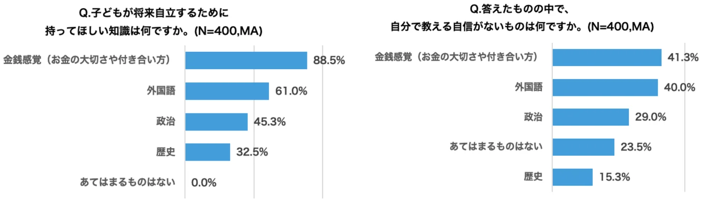 子どもの金融経済教育の実態については、約半数(49.3%)の親が「できていない」。将来自立するために持って欲しい知識は、「金銭感覚(お金の大切さや付き合い方)」が9割弱(88.5%)と最多だが、親が自分で教える自信がないものも「金銭感覚(お金の大切さや付き合い方)」(41.3%)が最多だった。