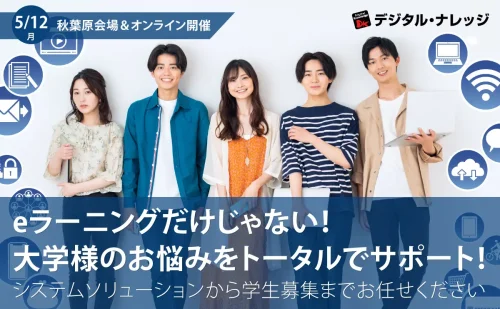 デジタル・ナレッジは、大学でeラーニングの導入を検討している担当者や、学生募集などに悩んでいる担当者などを対象に、「eラーニングだけじゃない! 大学の悩みをトータルでサポートするセミナー」を、5月12日に、東京・秋葉原の同社本社会場とオンラインのハイブリッド形式で無料開催する。