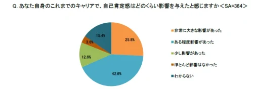 「自身のこれまでのキャリアで、自己肯定感はどのくらい影響を与えたと感じるか」との質問には、「非常に大きな影響があった」25.8%、「ある程度影響があった」42.6%、「少し影響があった」12.6%を合わせて、8割以上が自己肯定感がキャリアに影響を与えていると感じていることが分かった。