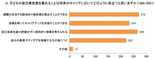 「子どもの自己肯定感を高めることは将来のキャリアでどのように役立つと思うか」と聞いたところ、「困難な状況でも前向きに解決策を見出すことができる」との回答が最も多く、次いで「自分自身を過小評価せずに前向きに物事を考えられる」が多く、いずれも7割以上だった。