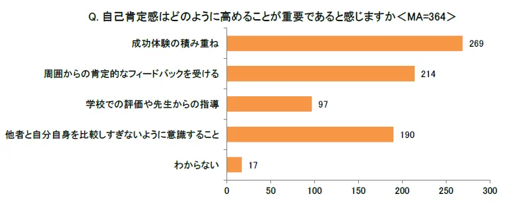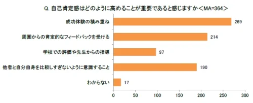 また、「自己肯定感はどのように高めることが重要であると感じるか」と聞いたところ、7割以上が「成功体験の積み重ね」と回答し最も多い結果となった。次いで「周囲から肯定的なフィードバックを受ける」が約6割と多く挙がった。
