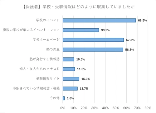 受験生に志望校を決定した時期を訊いたところ、最も多かったのは「中3の夏休み以降」で6割となった。保護者に学校や受験情報をどのように収集していたかを訊ねたところ、「学校のイベント」「学校のホームページ」など、学校の発信している情報を活用していることが分かった。また「塾の先生」からの情報も多かった。