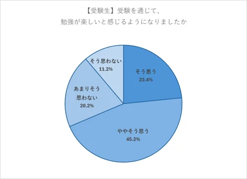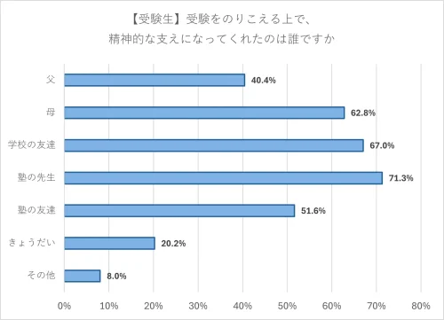 受験生の約7割が、受験を通じて勉強が楽しいと感じるようになったと回答した。また、受験を乗り越える上で精神的な支えになってくれた人を訊ねたところ、「塾の先生」が71.3%と最も多く、次いで「学校の友達」「母」と続いた。