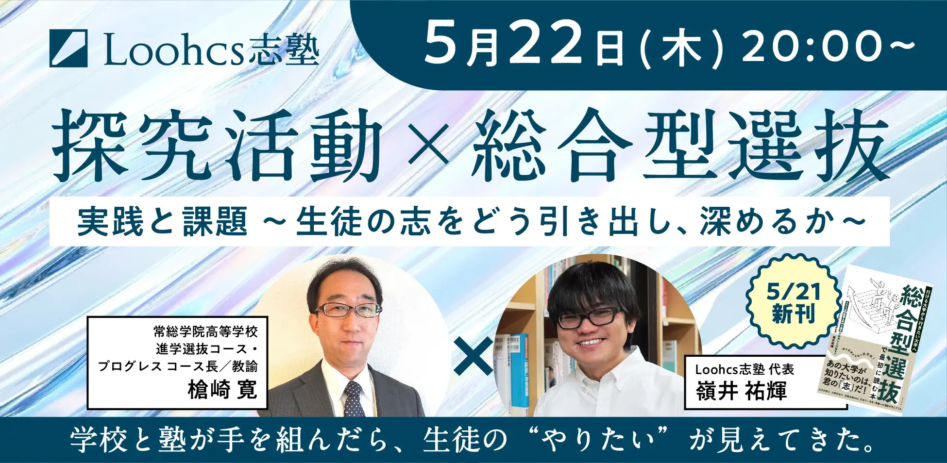 Loohcsは、教員向けのオンラインイベント「学校と塾の新しい連携モデル~探究活動を通じた総合型選抜対策の最前線~」を、5月22日に無料開催する。