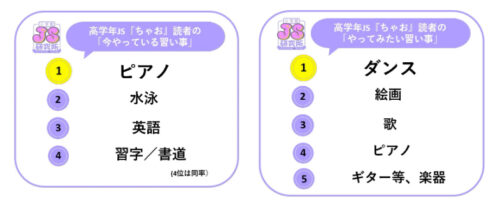 また、「今やっている習い事」を聞いたところ、1位「ピアノ」、2位「水泳」、3位「英語」という結果になった。学校の授業で取り組むような習い事に通うことが、高学年JSのスタンダードなようだ。