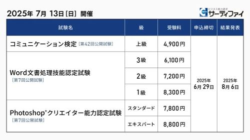 サーティファイは、7月13日に開催する「コミュニケーション検定」「Word文書処理技能認定試験」「Photoshopクリエイター能力認定試験」の公開試験の申込受付を4月28日から開始した。