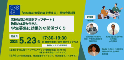 シンクアップが運営する学校広報ソーシャルメディア活用勉強会(GKB48)は、大学・短大・専門学校・高校の教職員を対象としたセミナー「高校訪問の常識をアップデート! 教員の本音から学ぶ、学生募集に効果的な関係づくり」を跡見学園女子大学で5月23日に開催する。