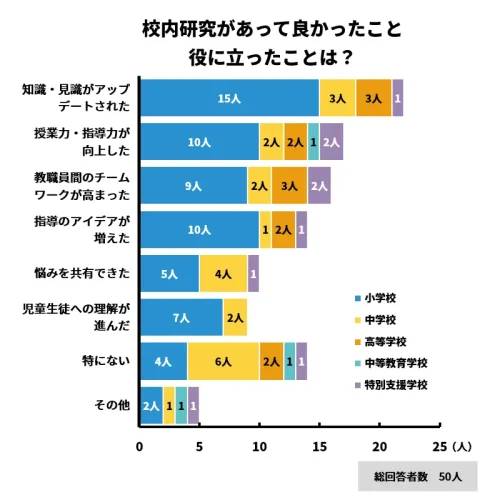 「校内研究があって良かったこと、役に立ったこと」を聞いたところ、小中高教職員の44%が「知識・見識がアップデートされたこと」と回答。前回の2022年調査と同様、最も多かった。次いで多かったのは、16%から34%に増加した「授業力・指導力が向上したこと」。