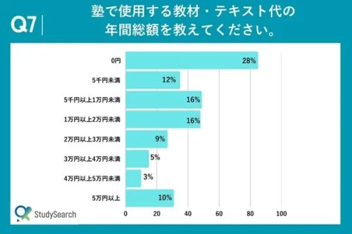 一方で、一定の教材費を負担している家庭も多く、「5千円以上1万円未満」16%、「1万円以上2万円未満」16%の範囲が特に目立った。塾のカリキュラムに合わせた教材を使用することで、学習効果を高めようとする傾向が伺える。