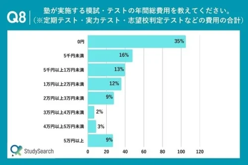 「塾が実施する模試・テストの年間総費用」(定期テスト・実力テスト・志望校判定テストなどの費用の合計)については、「0円」35%と回答した家庭が最も多く、塾で模試を受けていないケースも少なくないことが分かった。一方で、「5千円以上」の費用をかけている家庭も多く、特に受験対策を強化している塾では模試の受験が推奨される傾向がある。