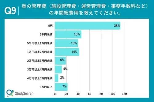 また、「5万円以上」7%の高額な管理費を負担している家庭もあり、これは特に設備が充実している塾や、長時間の自習スペースを提供している塾で見られる傾向。全体的に、塾の管理費は塾の運営方針によって大きく異なり、授業料とは別に発生するため、事前に確認しておくことが重要だ。