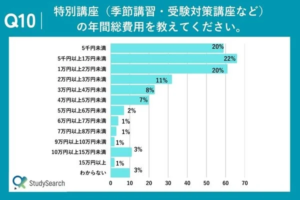 「特別講座」(季節講習・受験対策講座など)の年間総費用を尋ねたところ、特別講座の費用には幅があり、一部の家庭では比較的少額の支出に抑えている一方で、高額な講座を受講する家庭も一定数存在することが分かった。