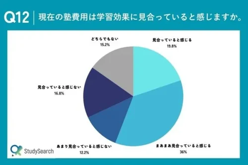 「現在の塾費用は学習効果に見合っていると感じるか」と質問したところ、「まあまあ見合っている」36%と感じている家庭が最も多く、次いで「見合っている」19.8%という回答が目立った。