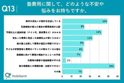 最後に、「塾費用に関して、どのような不安や悩みがあるか」を聞いたところ、多くの家庭が「毎月の支払いが家計を圧迫している」16%と感じていることが分かった。特に、受験学年に向けて塾費用が増加することに不安を感じる家庭が多く、長期的な負担を考慮しながら塾を選ぶ必要があることが伺える。