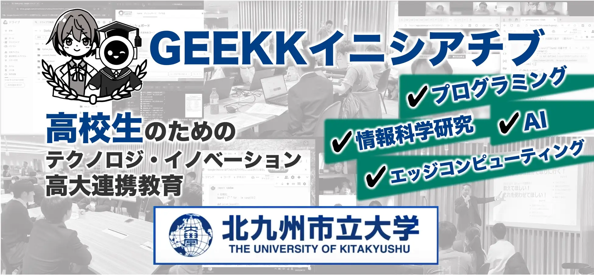 「GEEKKイニシアチブ」は、北九州地域をはじめ近郊と九州全域の特定の専門領域に対する強い興味や突出した能力を持つ高校生向け(高専生・高等専修学校生・中等教育学校生を含む)のプログラム。AIやIoTのような次世代技術を活用した体験型教育を実施し、探究する力や言語化スキルを持つ人材を育成する。