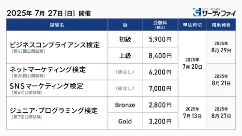 サーティファイは13日、7月27日に開催する「ビジネスコンプライアンス検定」「ネットマーケティング検定」「SNSマーケティング検定」「ジュニア・プログラミング検定」の公開試験の申込受付を開始した。