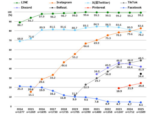 それによると、SNS利用率では、LINE(99.3%)が2014年の調査開始以来11年間トップ。Instagram(3.0ポイント増82.6%)は10年連続増の8割超となり、X(旧Twitter)を上回り初の2位となった。Instagramは、女子(91.6%)は2022年以降9割超で横ばいに対し男子(4.0ポイント増75.5%)は伸び続けており男女差が縮小している。X(2.7ポイント減78.2%)は3年連続で微減となり、10年ぶりに8割を下回った。