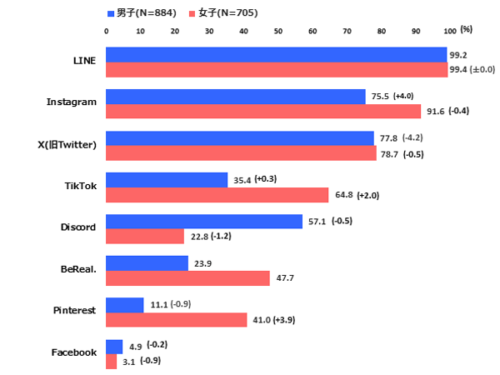 6年連続増のTiKTok(2.5ポイント増48.5%)は、女子(64.8%)が男子の約1.8倍となっている。初めて調査したBeReal.(34.4%)は、女子(47.7%)が男子の約2倍となる半数近くが利用しており、若い世代での人気を裏付ける結果となった。また、Discord(41.9%)は男子(57.1%)が女子の約2.5倍、Pinterest(24.4%)は女子(41.0%)が男子の約3.7倍の利用率となっている。
