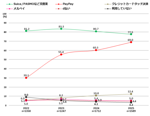 電子マネーの利用率ではPayPay(8.7ポイント増69.0%)が3年間で約2.3倍となる約7割に達し、他サービスに比べ大きく伸びている。また、全体でも96.8%が電子マネーを利用している。