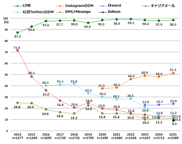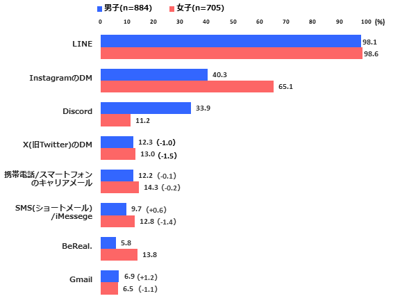 利用率と共に連絡手段でもLINE(98.3%)が11年間トップ。続いてInstagramのDM(3.3ポイント増51.3%))が初めて半数超となった。3位のDiscord(23.9%)は男子(2.6ポイント増33.9%)が女子の約3倍となっている。XのDM(1.2ポイント減12.6%)は3年連続で減少、キャリアメール(0.2ポイント増13.2%)はこれをわずかに上回った。
