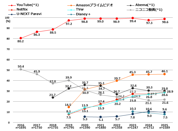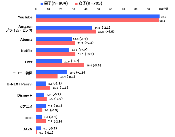 動画サービスは、YouTube(98.6%)が2019年以降連続で95%以上をキープ。2位のAmazonプライム・ビデオ(0.4ポイント増46.1%)、3位のAbema(0.5ポイント減29.8%)、4位のNetflix(1.7ポイント増28.9%)はいずれも横ばい。6年連続増のTVer(1.8ポイント増28.6%)はこれらに並ぶ水準となった。