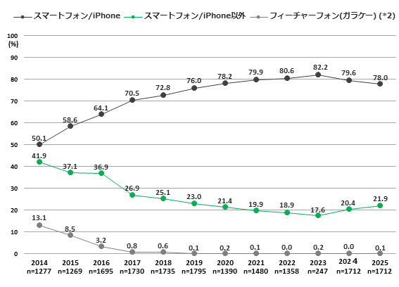 iPhoneの利用率(1.6ポイント減78.0%)は約8割の高水準を維持する一方、昨年に続き2年連続の微減となった。iPhone以外(1.5ポイント増21.9%)は同微増傾向となっている。