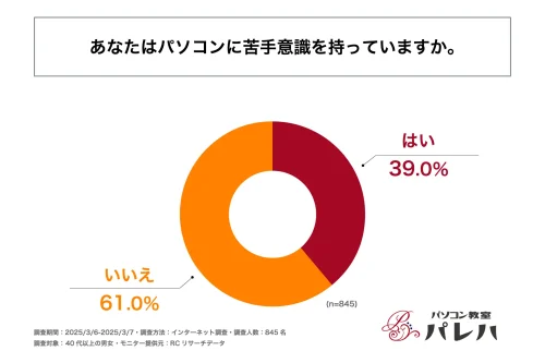 「パソコンに苦手意識を持っているか」の設問には「いいえ」が61.0%、「はい」が39.0%で、40代以上の大人の約4割がパソコンに苦手意識を持っている。