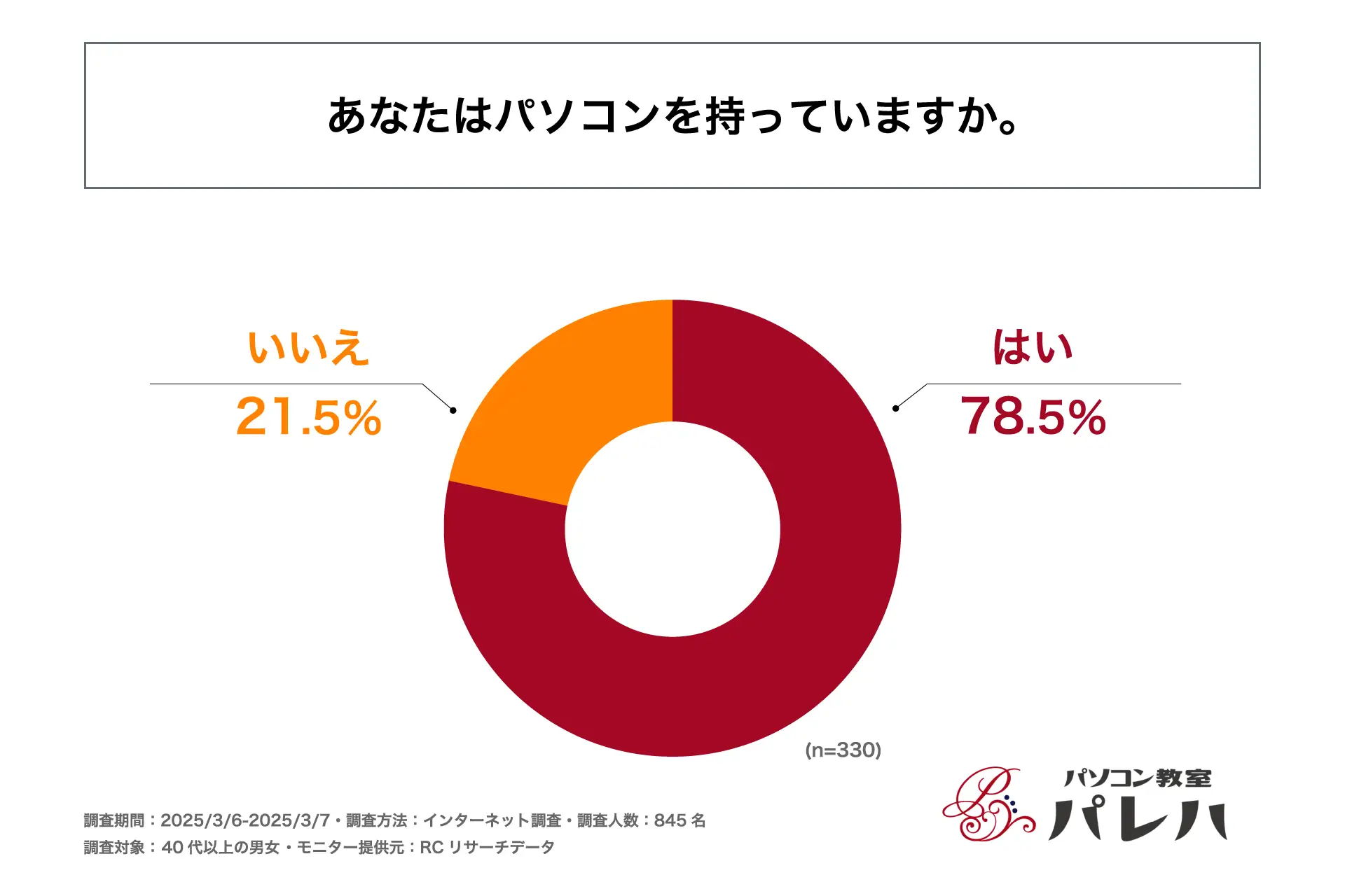 パソコンに苦手意識を持っていると回答した人に「パソコンを持っているか」尋ねたところ、「はい」が78.5%、「いいえ」が21.5%。パソコンに苦手意識を持っている人でも約8割はパソコンを所持している。