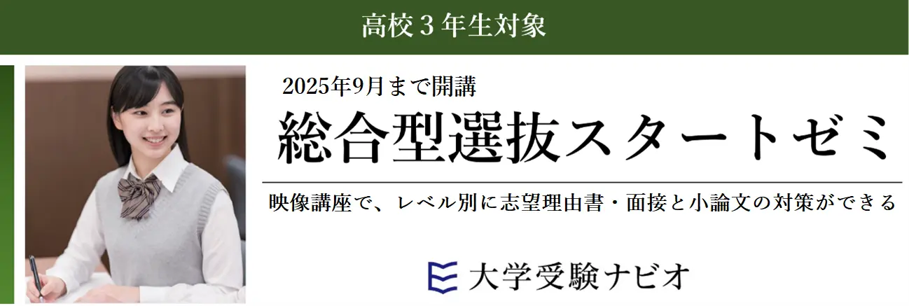 2026年度入試に総合型選抜での大学受験を志望する高校3年生を対象に、動画プラットフォーム「Vimeo」で実施する。受講期間は9月30日まで。受講料は3万3000円(税込)、別途教材費がかかる。申込・問い合わせは大学受験ナビオの各教室へ。